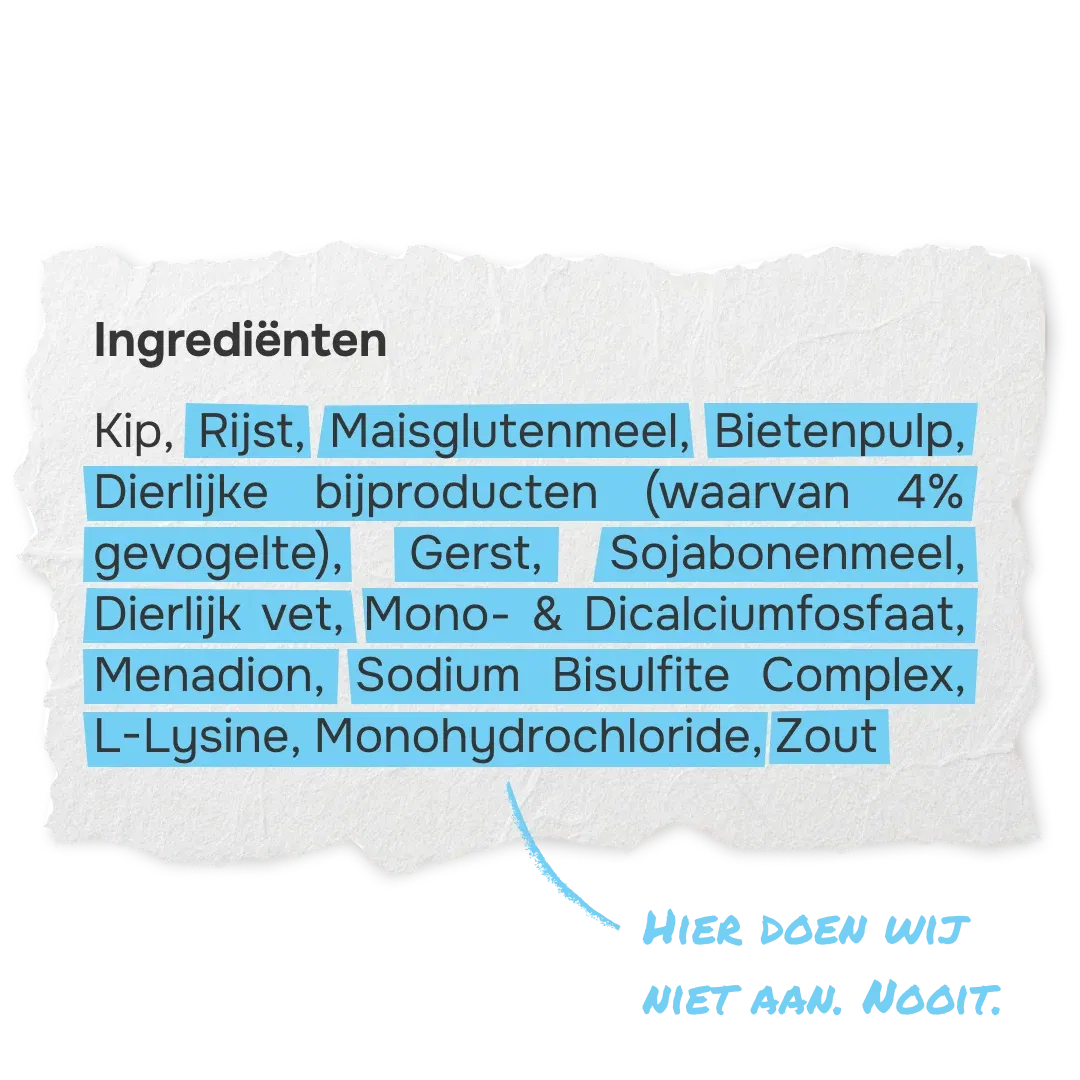 Hoewel op de verpakking 'vers' staat, kan het product allesbehalve vers zijn. Alle ingrediënten die ooit vers waren (vaak restvlees en granen van lage kwaliteit) worden gekookt op een temperatuur tot 200°C, wat de natuurlijke voedingsstoffen die ooit aanwezig waren, vernietigd.